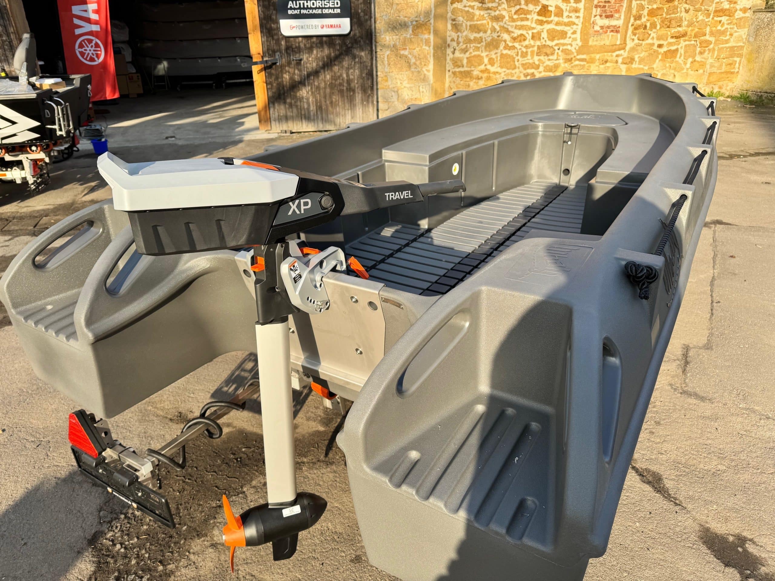 Whaly 400 affordable boat with electric motor, high value for price: length 395 cm, weight 210